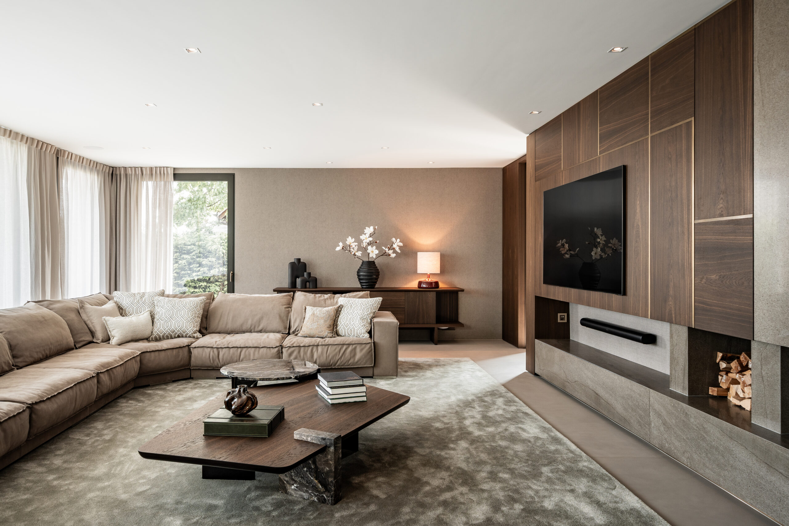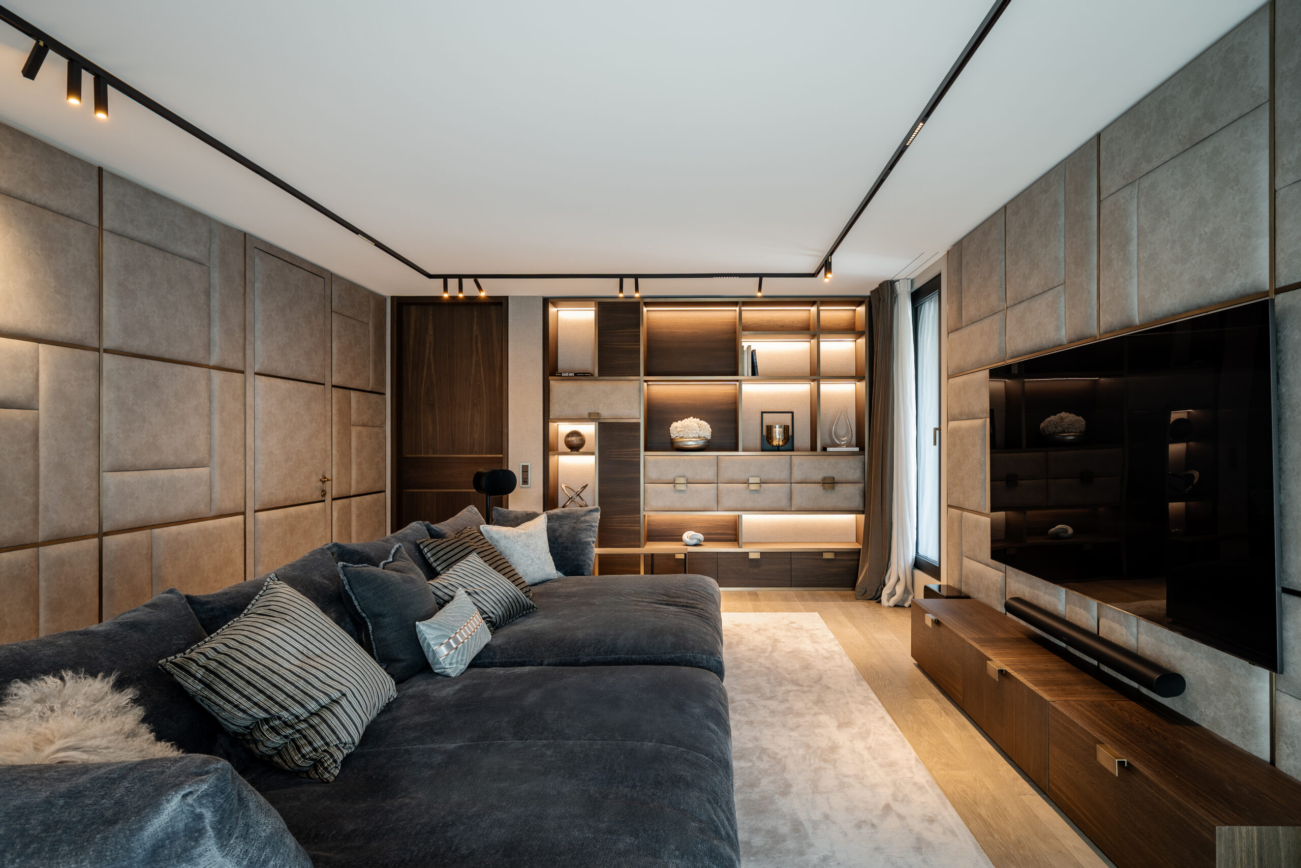 The cinema is a cocoon-like retreat, with oversized seating, bespoke cabinetry, and a discreet bar that adds conviviality without compromising the intimate atmosphere. The walls are clad in eco-leather acoustic panels, ensuring comfort and clarity, while a soft carpet underfoot reinforces the sense of immersion during screenings.