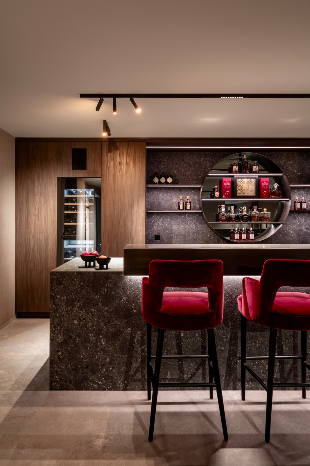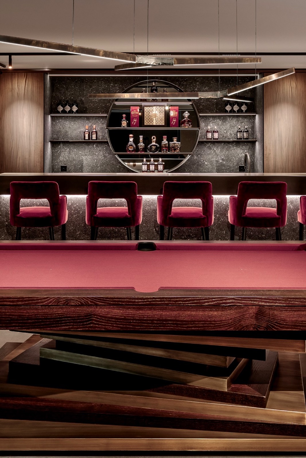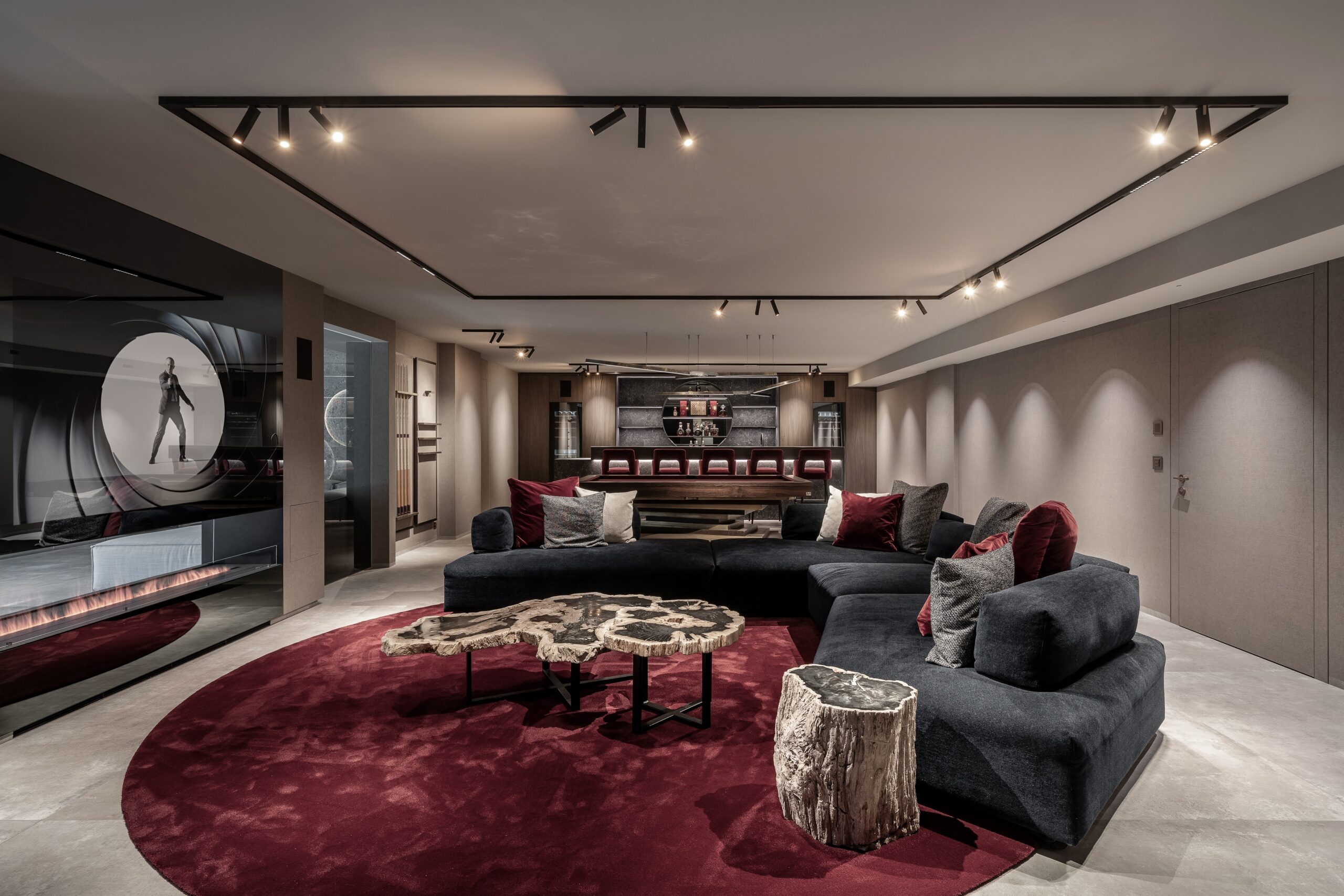 The residence culminates in the club room, where a lounge, bar, and pool table framed by deep red accents create a lively yet refined atmosphere. A mirror-TV above a double-sided fireplace links the space visually to the gym, making it the social heart of the home.