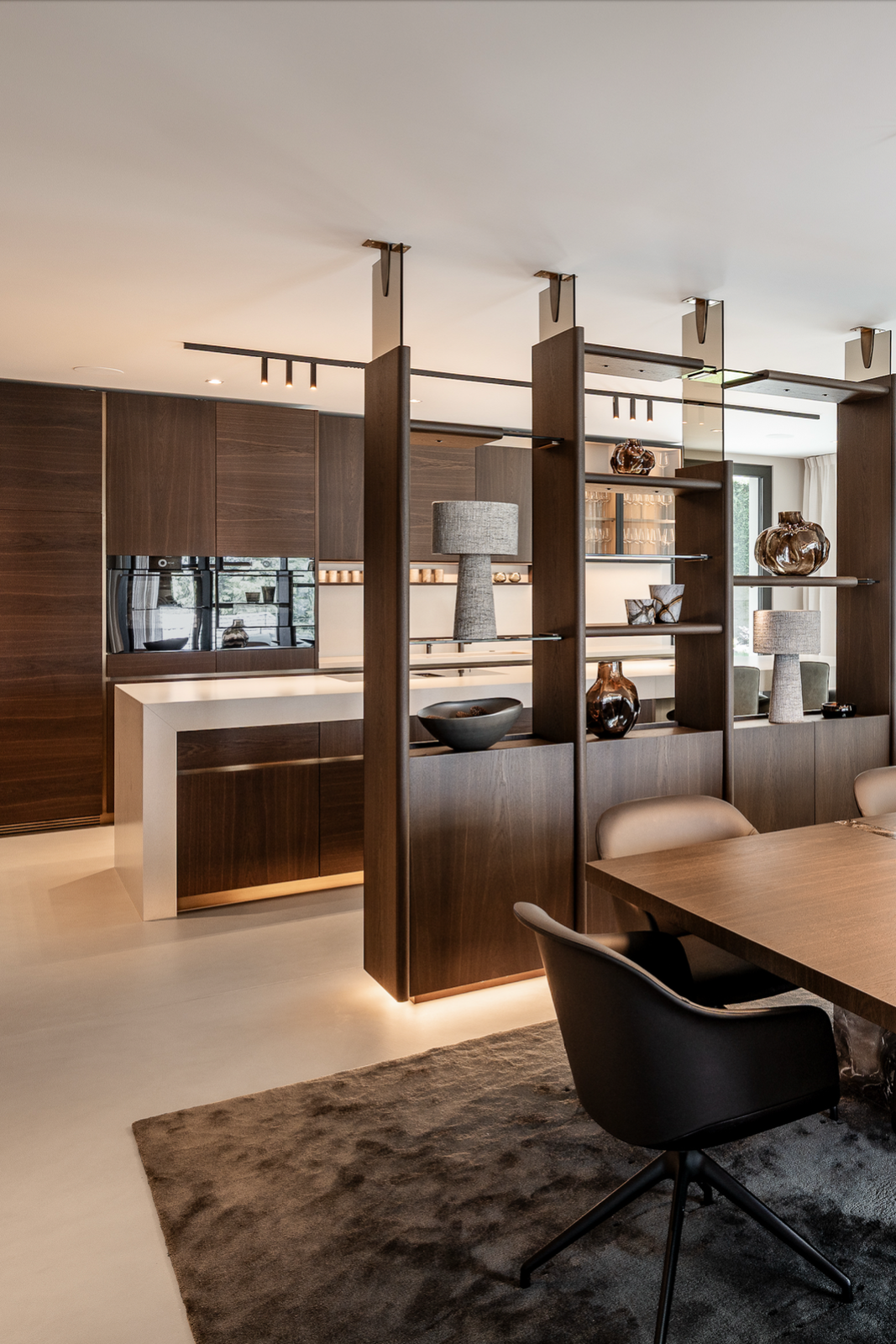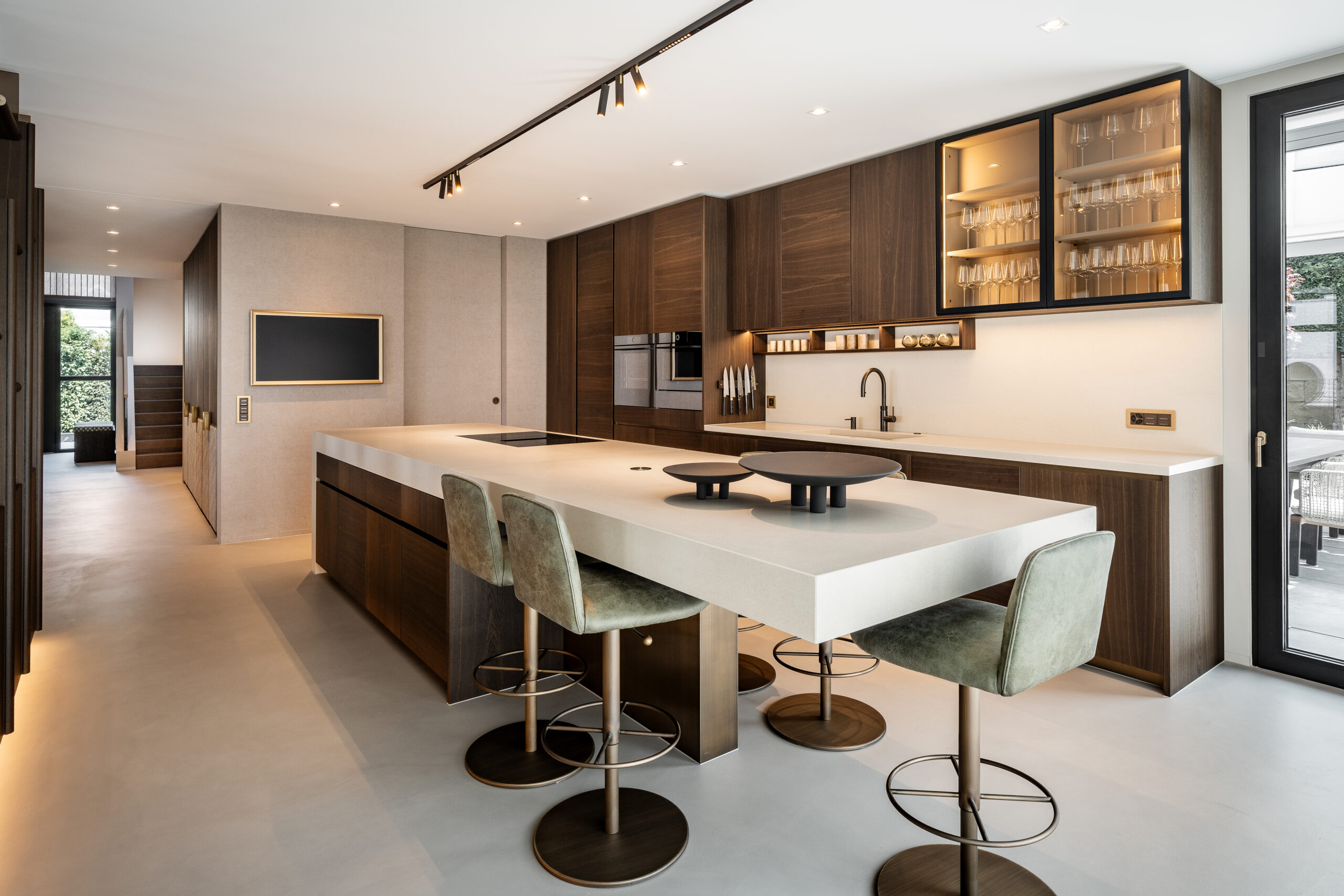 The kitchen forms the heart of the house, with custom cabinetry, brass accents, and pale stone worktops. A concealed pantry preserves clean lines and order.