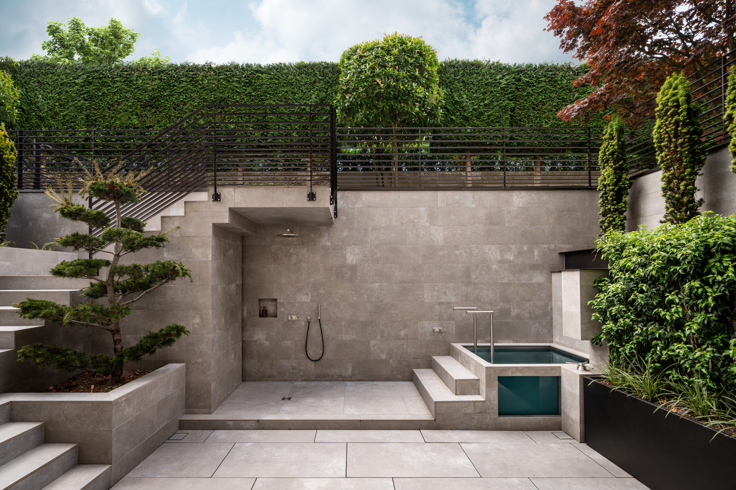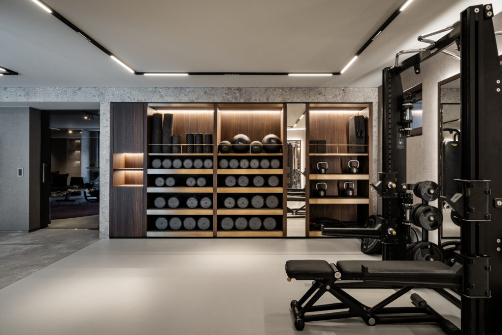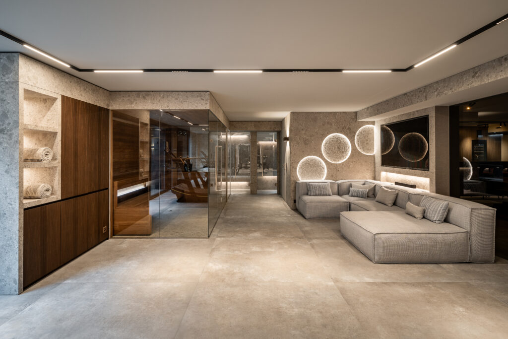 The wellness zone includes a spa, steam bath, and sauna, extending into a courtyard with a cold plunge and outdoor shower. Stone, water, and light create an immersive balance, while the adjacent gym, equipped with Technogym machines and a sofa for rest, reinforces the focus on well-being and mental harmony.