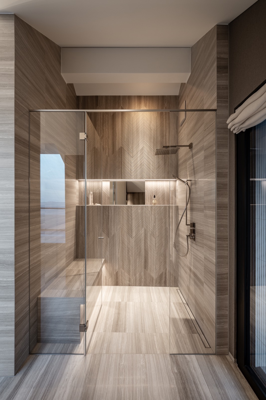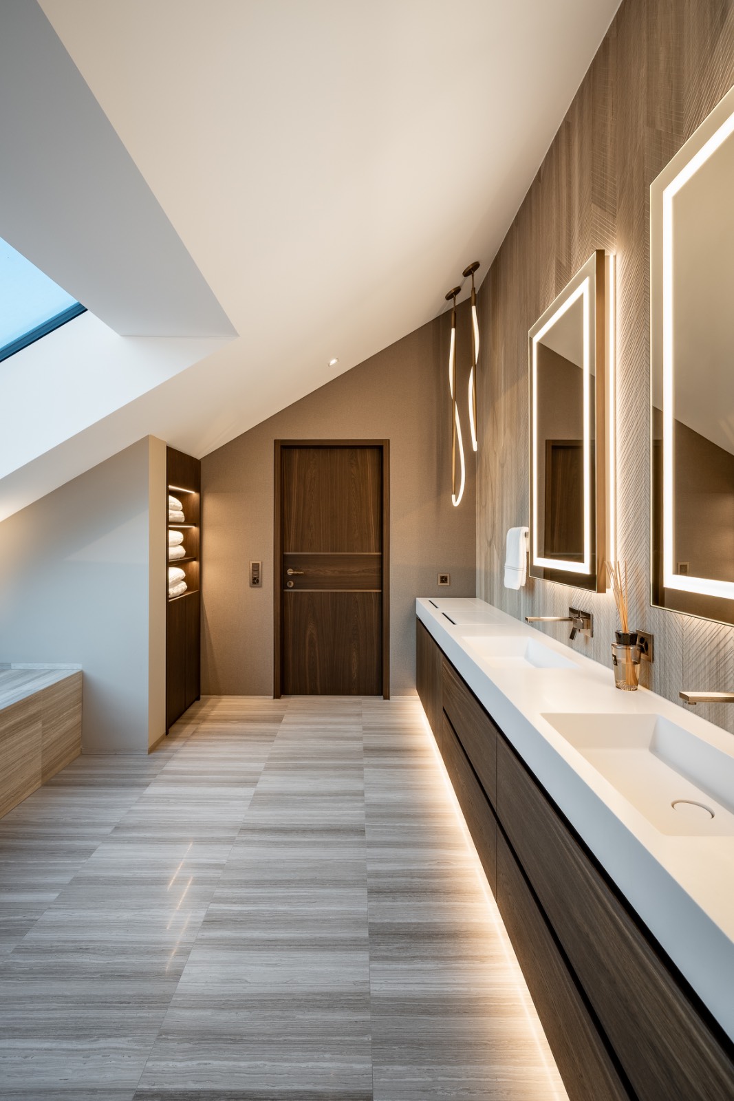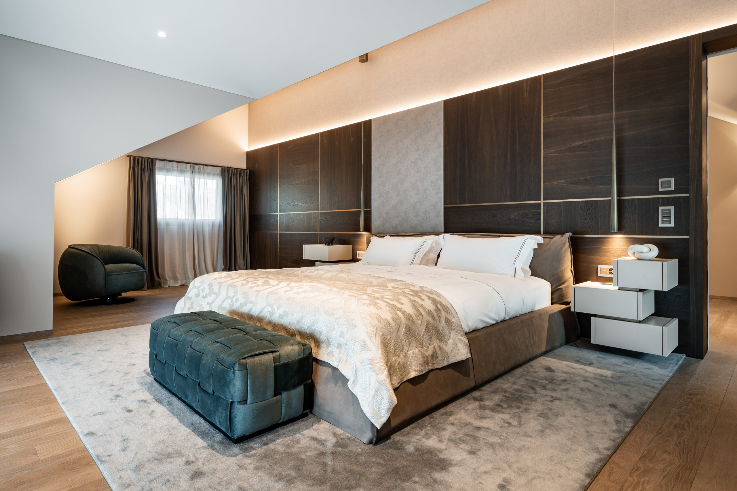 Private quarters offer intimacy and warmth, with soft fabrics, tailored wood panelling, and bathrooms where natural stone and clean lines transform daily rituals into moments of quiet luxury.