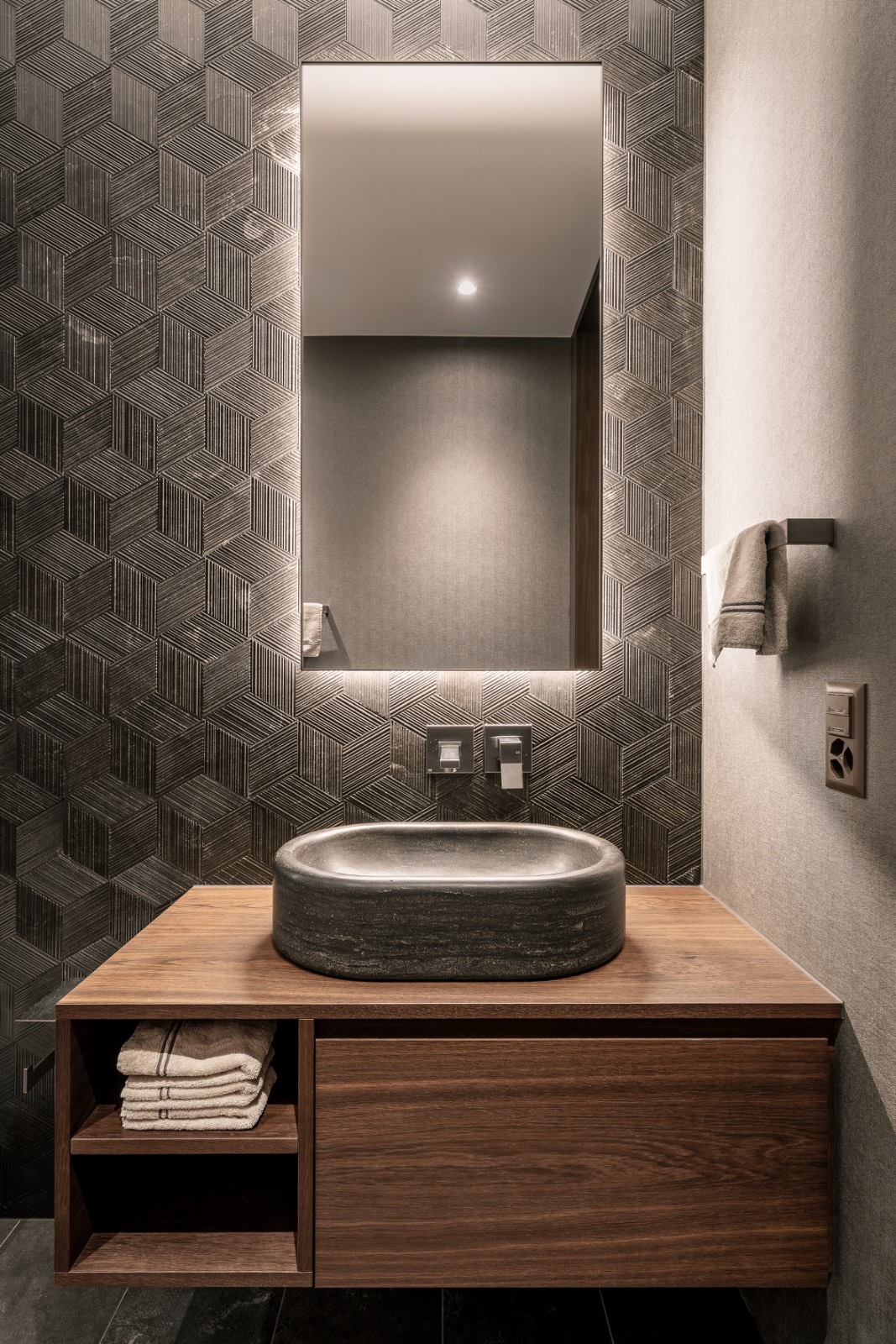 The ensuite bathroom is clad in Pietra d’Avola stone by Salvatori. A backlit mirror with brass detailing provides a warm glow, creating a serene retreat seamlessly connected to the cinema.