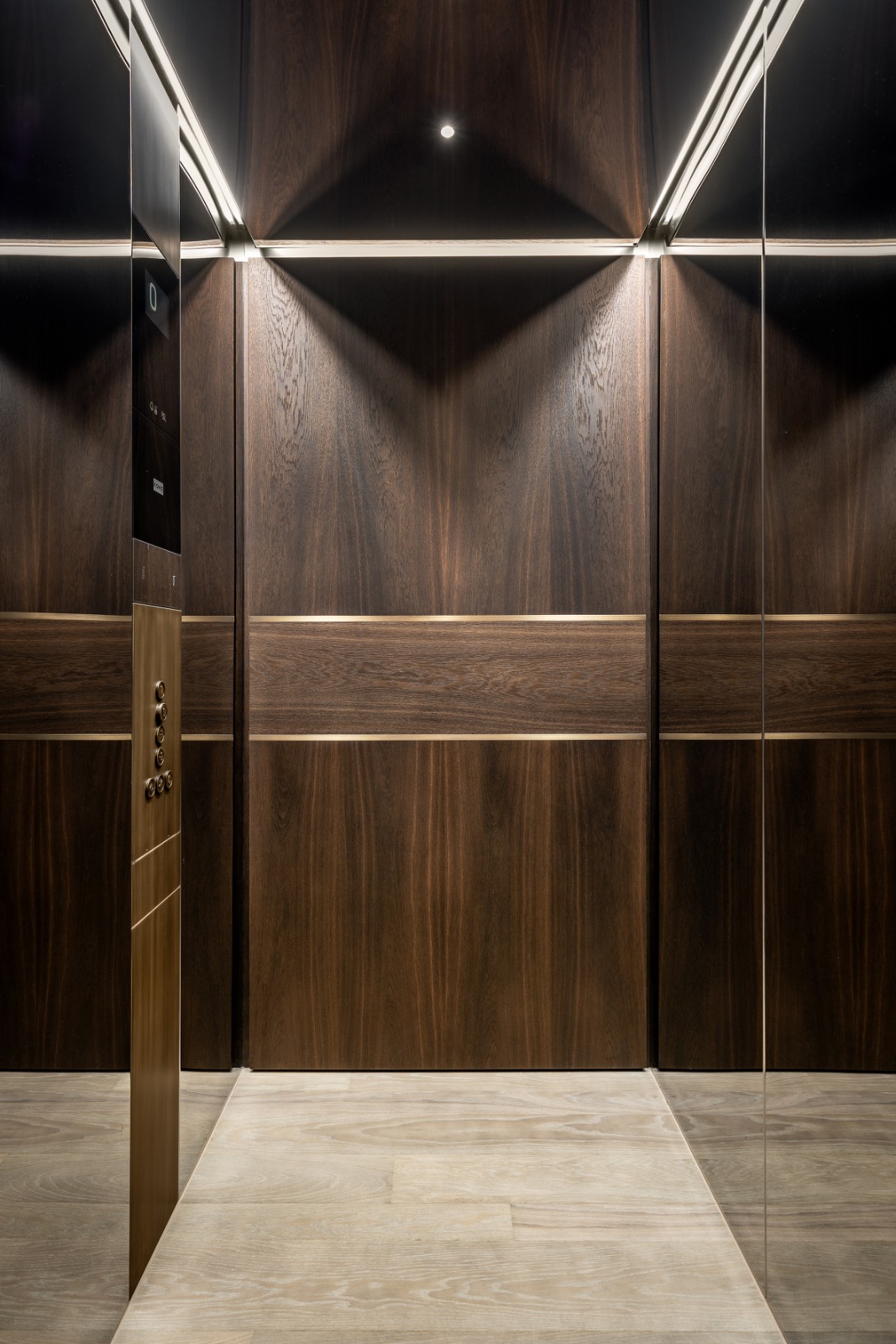 The elevator and hallway closets continue the home’s material language, with warm wood and brass accents extending refinement into everyday transitions.