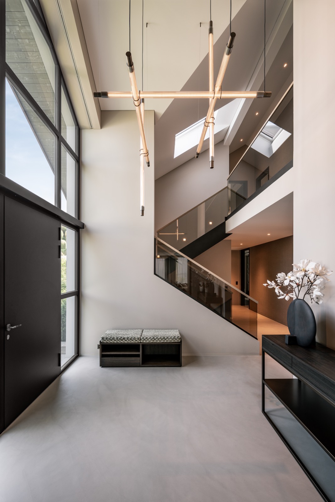 The entrance, with its monumental door and soaring height, is grounded by stone flooring and illuminated by natural light. A console by Martinuzzi Collection and a chandelier by Henge balance drama and restraint, creating a calm but impressive arrival.