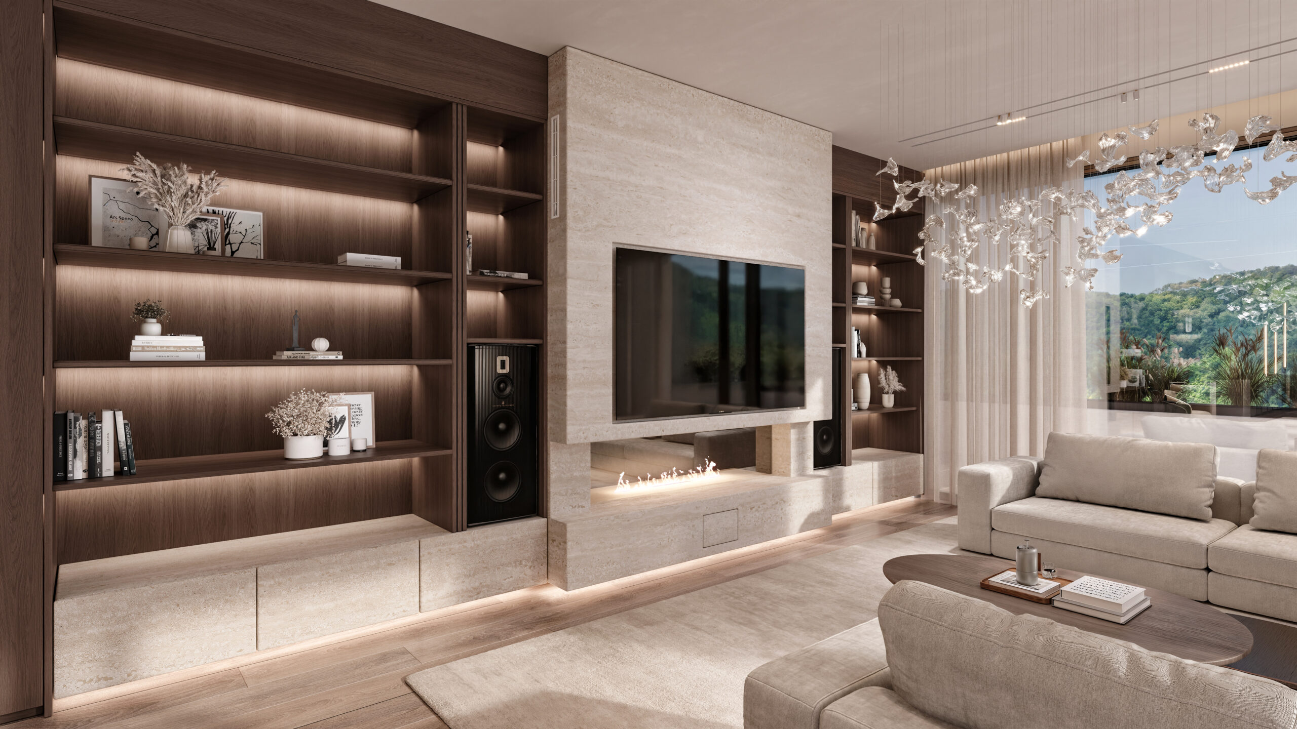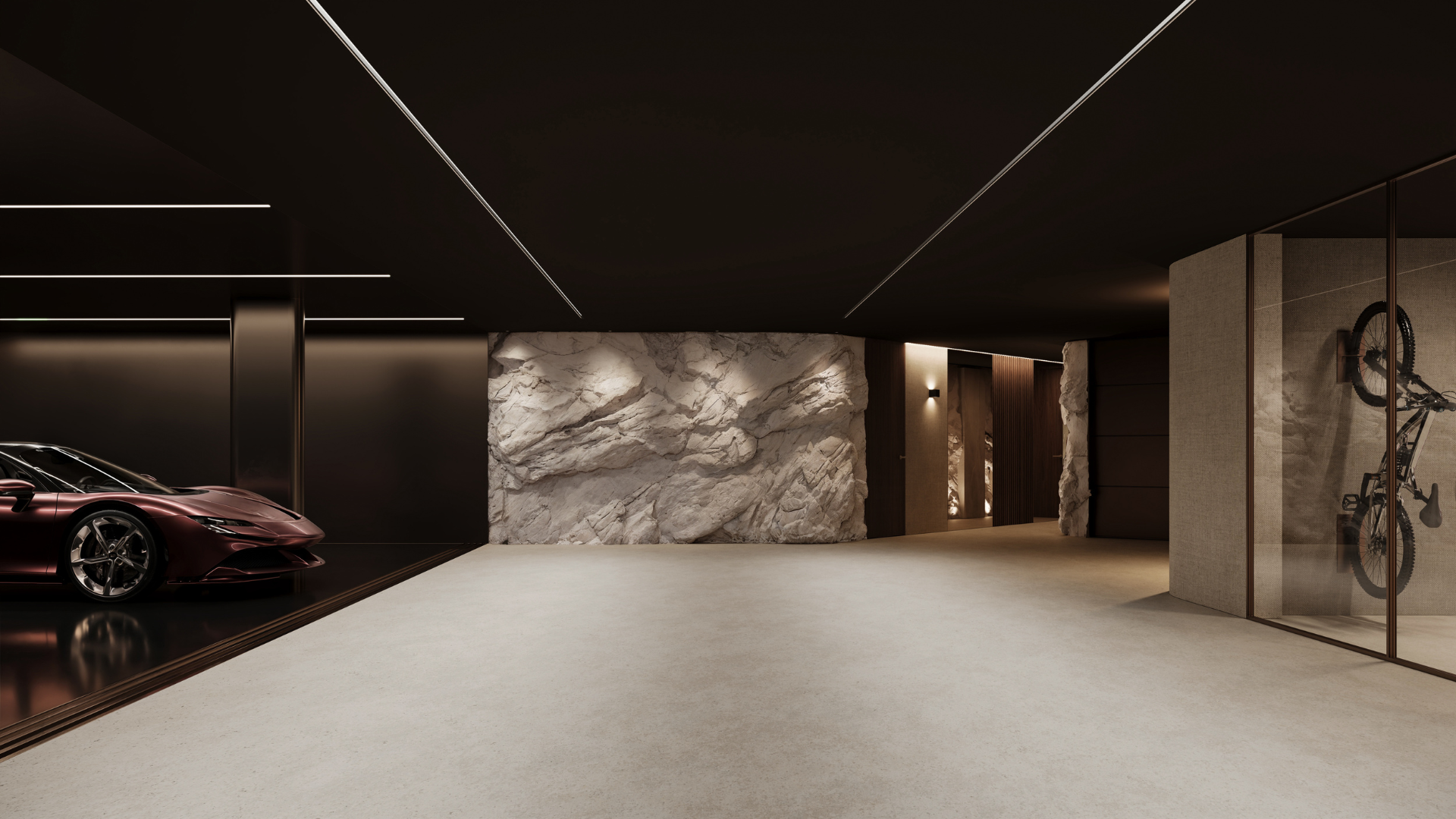 Die Garage ist als funktionaler und dennoch durchdachter Raum in das Design integriert. Ihre Proportionen und Oberflächen entsprechen der Gesamtphilosophie des Projekts und sorgen dafür, dass auch technische Bereiche zur Kohärenz der Residenz beitragen.