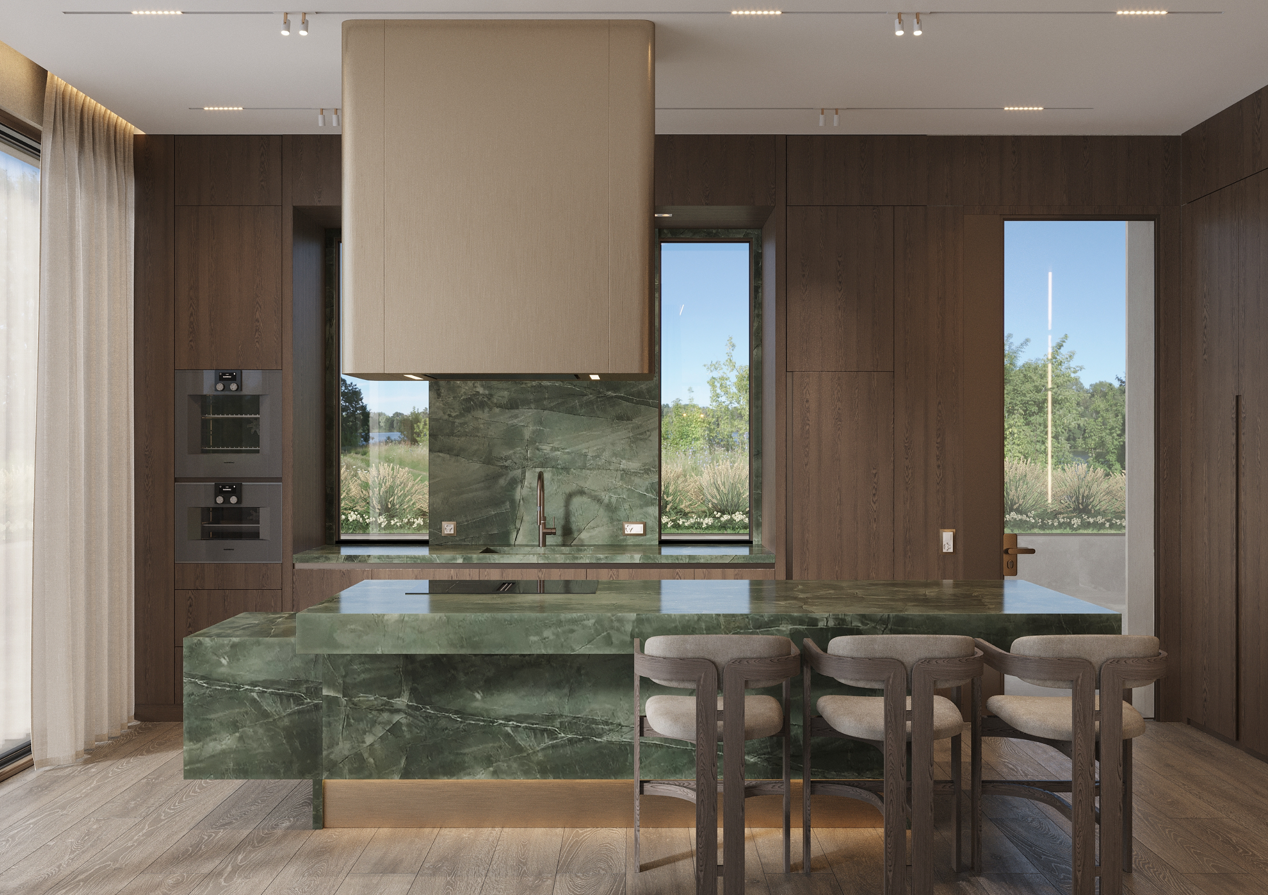 Die Küche zeichnet sich durch klare Linien und eine starke Ordnung aus, mit einer großen Insel als Mittelpunkt. Steinoberflächen sorgen für Helligkeit und Langlebigkeit, während die warmen Farbtöne der Schränke die Gesamtgeometrie abmildern. Natürliches Licht wertet den Raum auf und schafft einen ruhigen und funktionalen Mittelpunkt des Hauses.