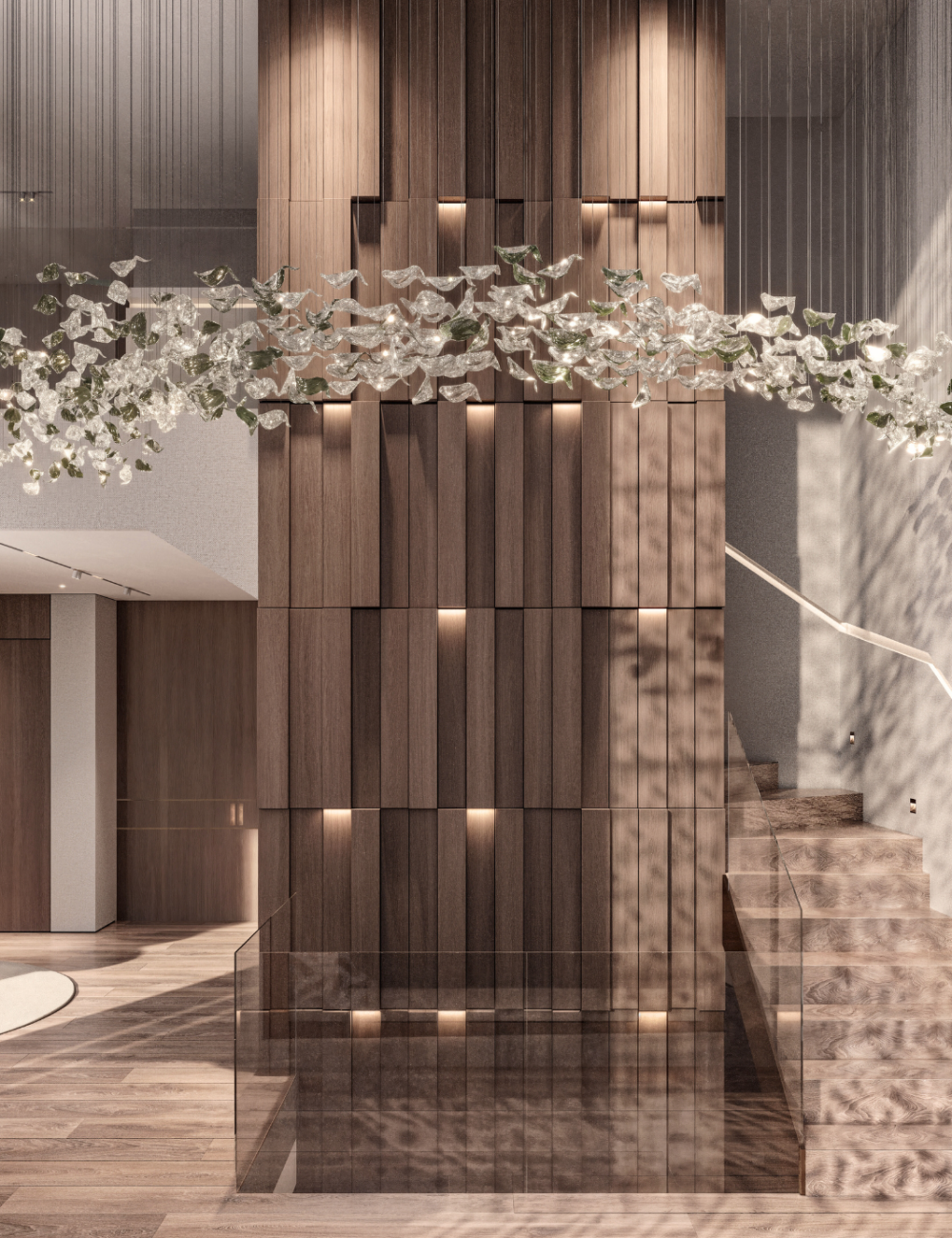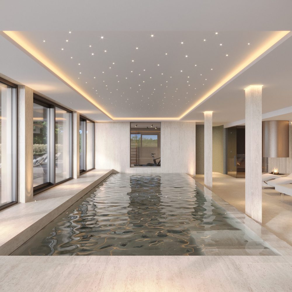 Der Wellnessbereich umfasst einen Pool, einen Spa-Bereich und einen Fitnessraum, die als Teil des Alltags und nicht als separate Einrichtungen konzipiert sind. Große Öffnungen lassen natürliches Licht in den Raum, während Stein und Wasser eine Umgebung schaffen, die Energie und Ruhe in Einklang bringt. Der Fitnessraum erweitert den Fokus auf das Wohlbefinden und verbindet Leistung mit einer auf Komfort ausgelegten Umgebung.