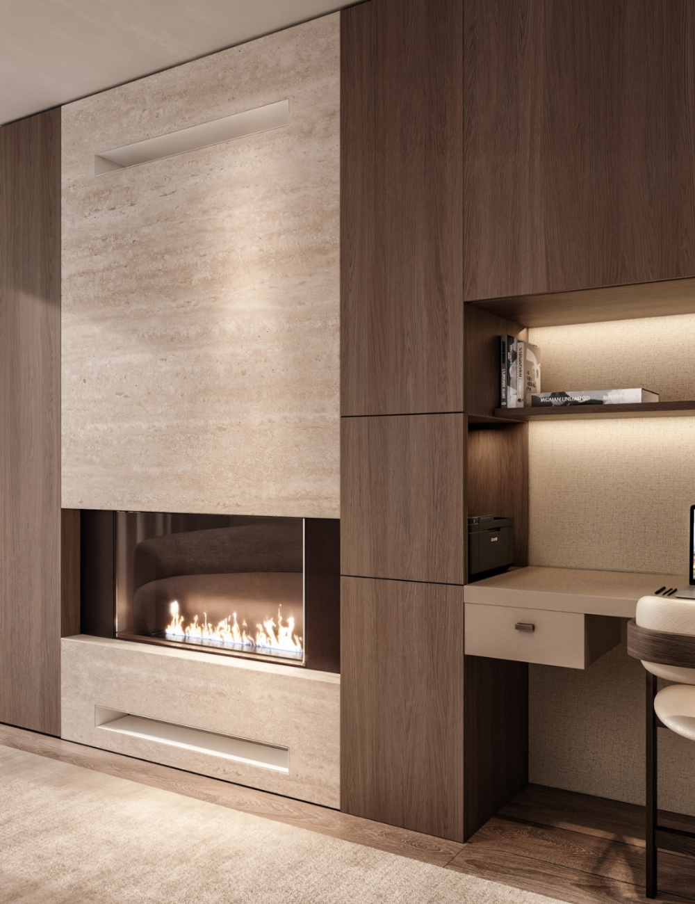 Die Hauptwohnbereiche sind offen und fließend gestaltet und umgeben eine Küche, die Natursteinoberflächen mit maßgefertigten Holzdetails kombiniert. Parkettböden und Boiserie sorgen für Wärme, während eine neutrale Farbpalette mit bronzefarbenen Akzenten Ruhe und Vielseitigkeit vermittelt.